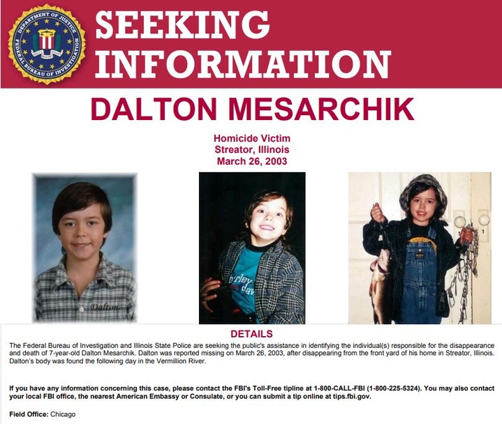 #FBIChicago and the @ILStatePolice continue to seek the public’s assistance in identifying the individual(s) responsible for the disappearance and death of Dalton. Report tips (even anonymously) at 1-800-CALL-FBI (1-800-225-5324) or tips.fbi.gov. #SeekingInformation For more information, visit: http://www.fbi.gov/wanted/seeking-info/dalton-mesarchik.